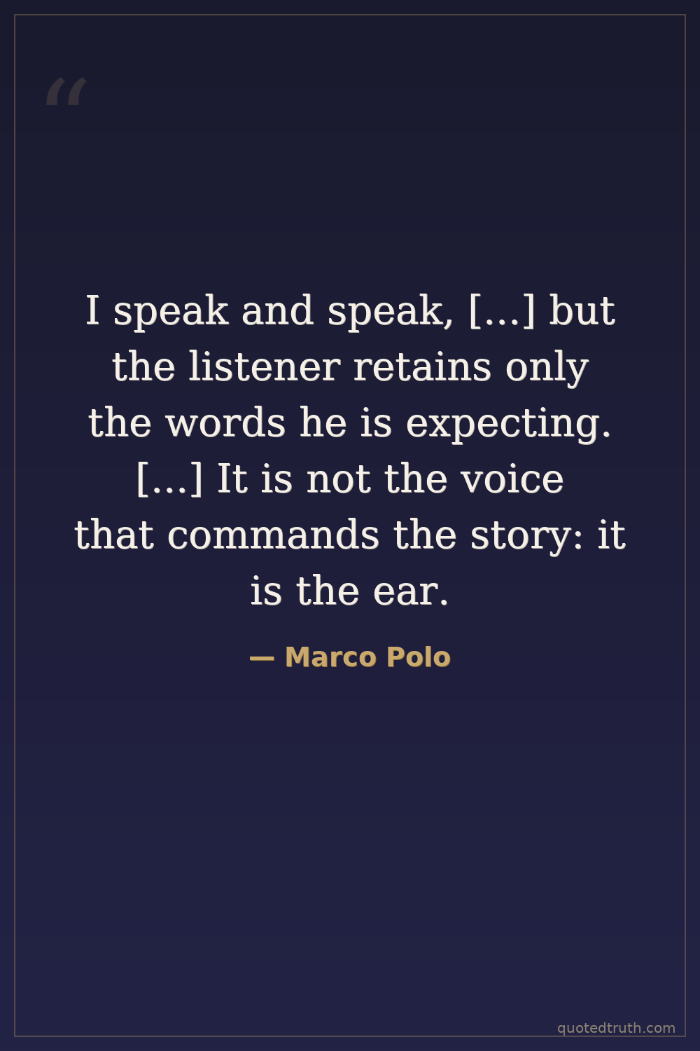 I speak and speak, [...] but the listener retains only the words he is expecting. [...] It is not the voice that commands the story: it is the ear.