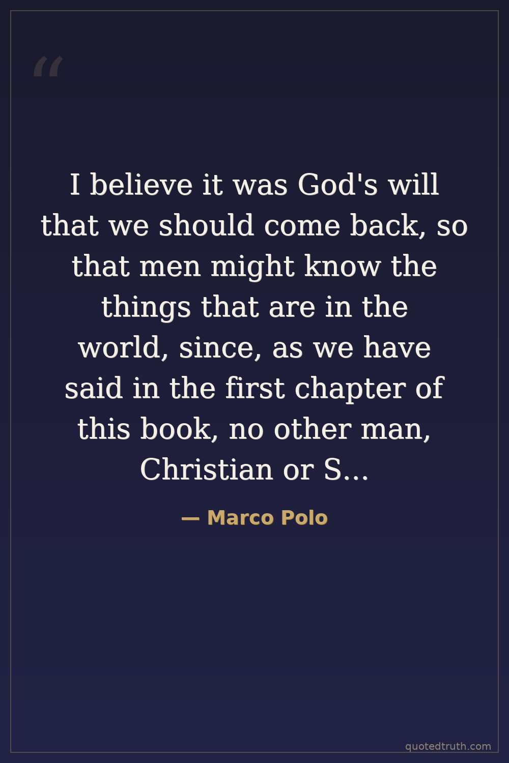 I believe it was God's will that we should come back, so that men might know the things that are in the world, since, as we have said in the first chapter of this book, no other man, Christian or Saracen, Mongol or pagan, has explored so much of the world as Messer Marco, son of Messer Niccolo Polo, great and noble citizen of the city of Venice.