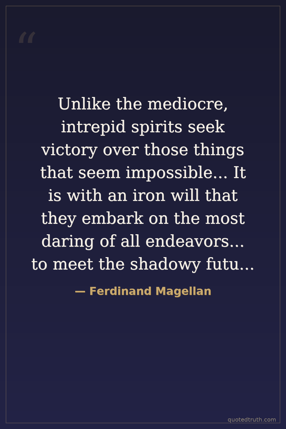 Unlike the mediocre, intrepid spirits seek victory over those things that seem impossible... It is with an iron will that they embark on the most daring of all endeavors... to meet the shadowy future without fear and conquer the unknown. — Ferdinand Magellan Early Modern First circumnavigation