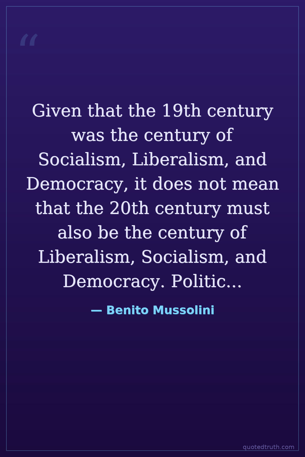 Given that the 19th century was the century of Socialism, Liberalism, and Democracy, it does not mean that the 20th century must also be the century of Liberalism, Socialism, and Democracy. Political doctrines pass; peoples remain. It is to be expected that this century may be that of authority, a century of the 'right,' a Fascist century.