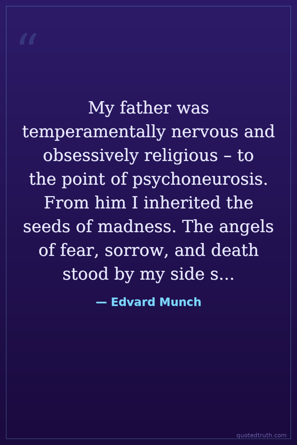 My father was temperamentally nervous and obsessively religious – to the point of psychoneurosis. From him I inherited the seeds of madness. The angels of fear, sorrow, and death stood by my side since the day I was born.