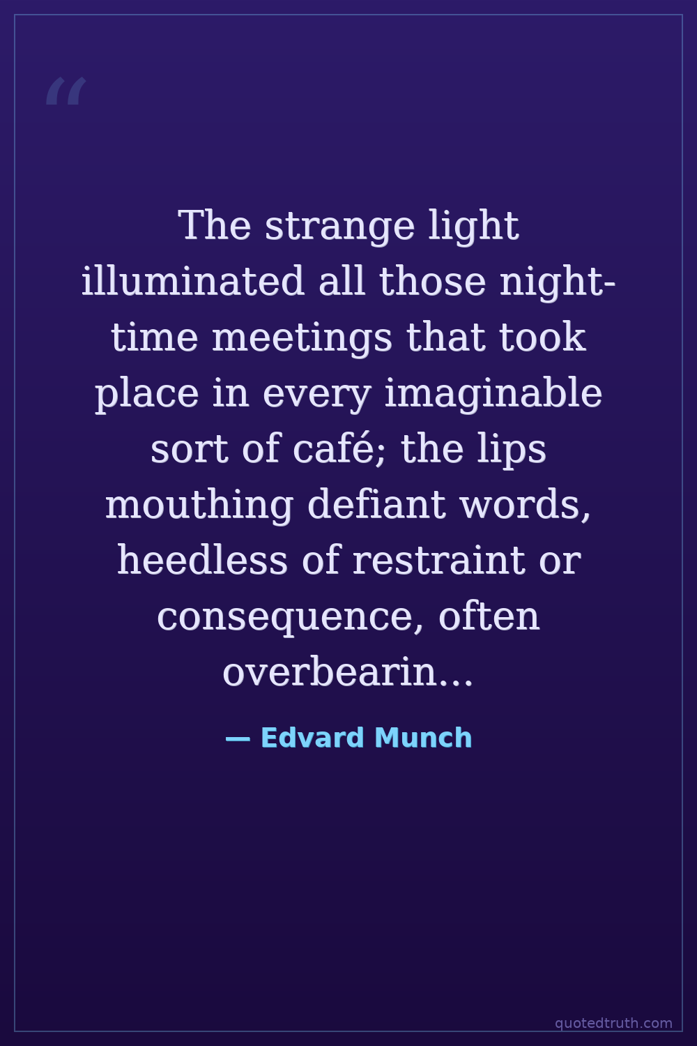 The strange light illuminated all those night-time meetings that took place in every imaginable sort of café; the lips mouthing defiant words, heedless of restraint or consequence, often overbearing and brutal as only Norwegians can be, vast shadows of impotence misery and shabbiness – spirits training for fulfillment, striving in vain to be great, complete, unique.