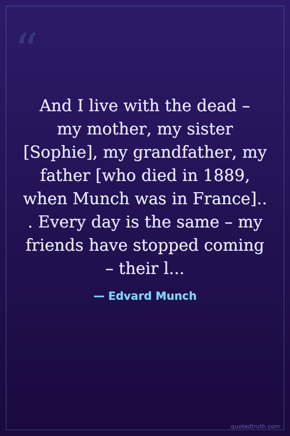 And I live with the dead – my mother, my sister [Sophie], my grandfather, my father [who died in 1889, when Munch was in France].. . Every day is the same – my friends have stopped coming – their laughter disturbs me, tortures me.. ..my daily walk round the old castle becomes shorter and shorter, it tires me more and more to take walks. The fire in the fireplace is my only friend – the time I spend sitting in front of the fireplace gets longer and longer.. ..at its worst I lean my head against the fireplace overwhelmed by the sudden urge – Kill yourself and then it's all over. Why live?