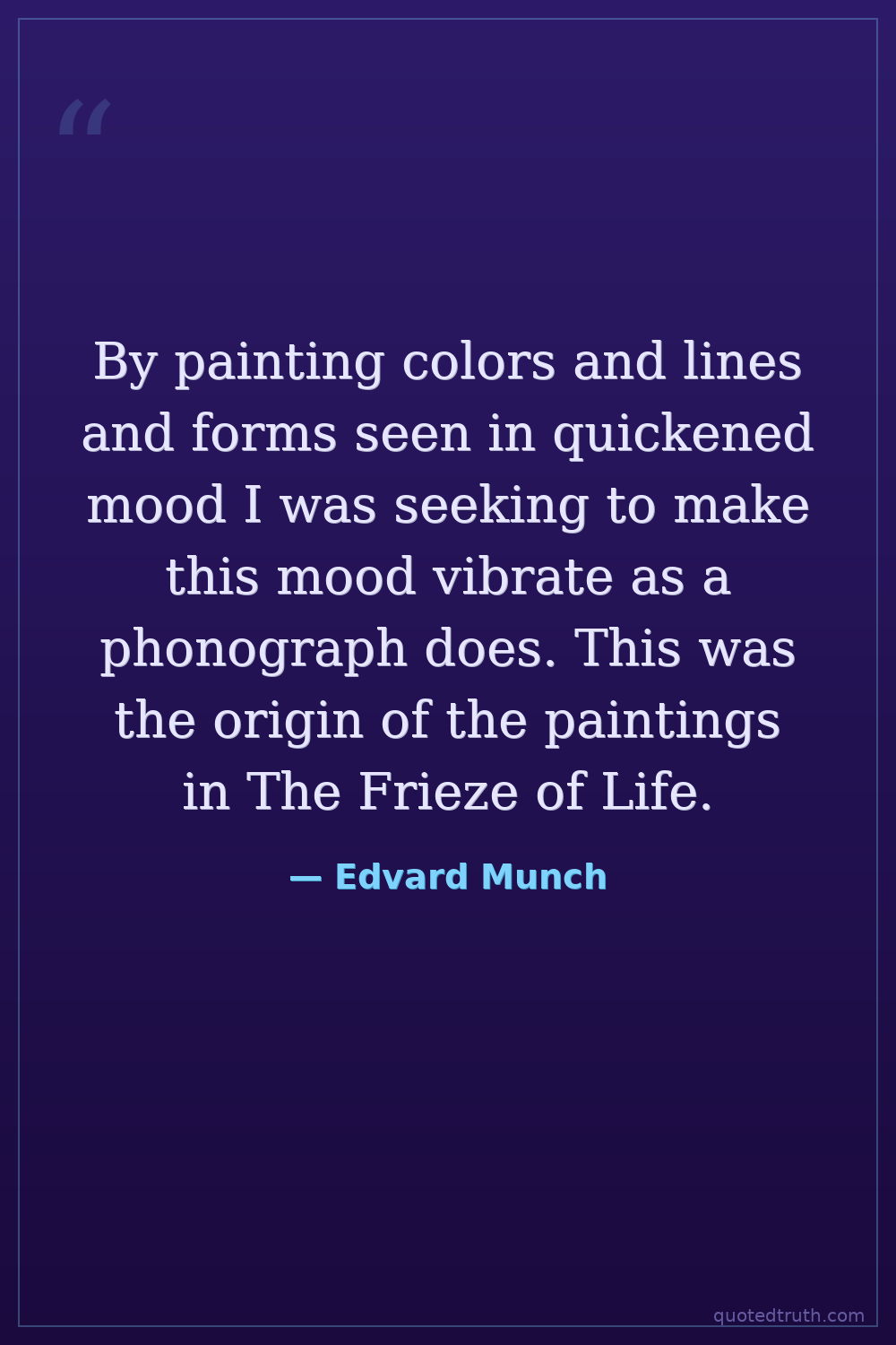 By painting colors and lines and forms seen in quickened mood I was seeking to make this mood vibrate as a phonograph does. This was the origin of the paintings in The Frieze of Life.