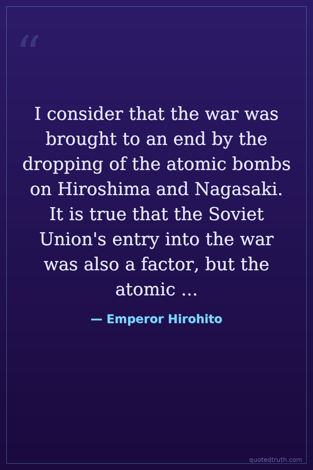 I consider that the war was brought to an end by the dropping of the atomic bombs on Hiroshima and Nagasaki. It is true that the Soviet Union's entry into the war was also a factor, but the atomic bombs were the primary reason. — Emperor Hirohito Modern Japanese Emperor during WWII