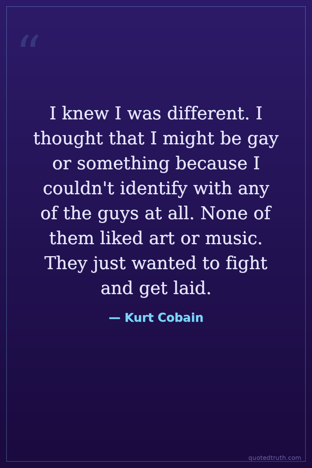 I knew I was different. I thought that I might be gay or something because I couldn't identify with any of the guys at all. None of them liked art or music. They just wanted to fight and get laid.