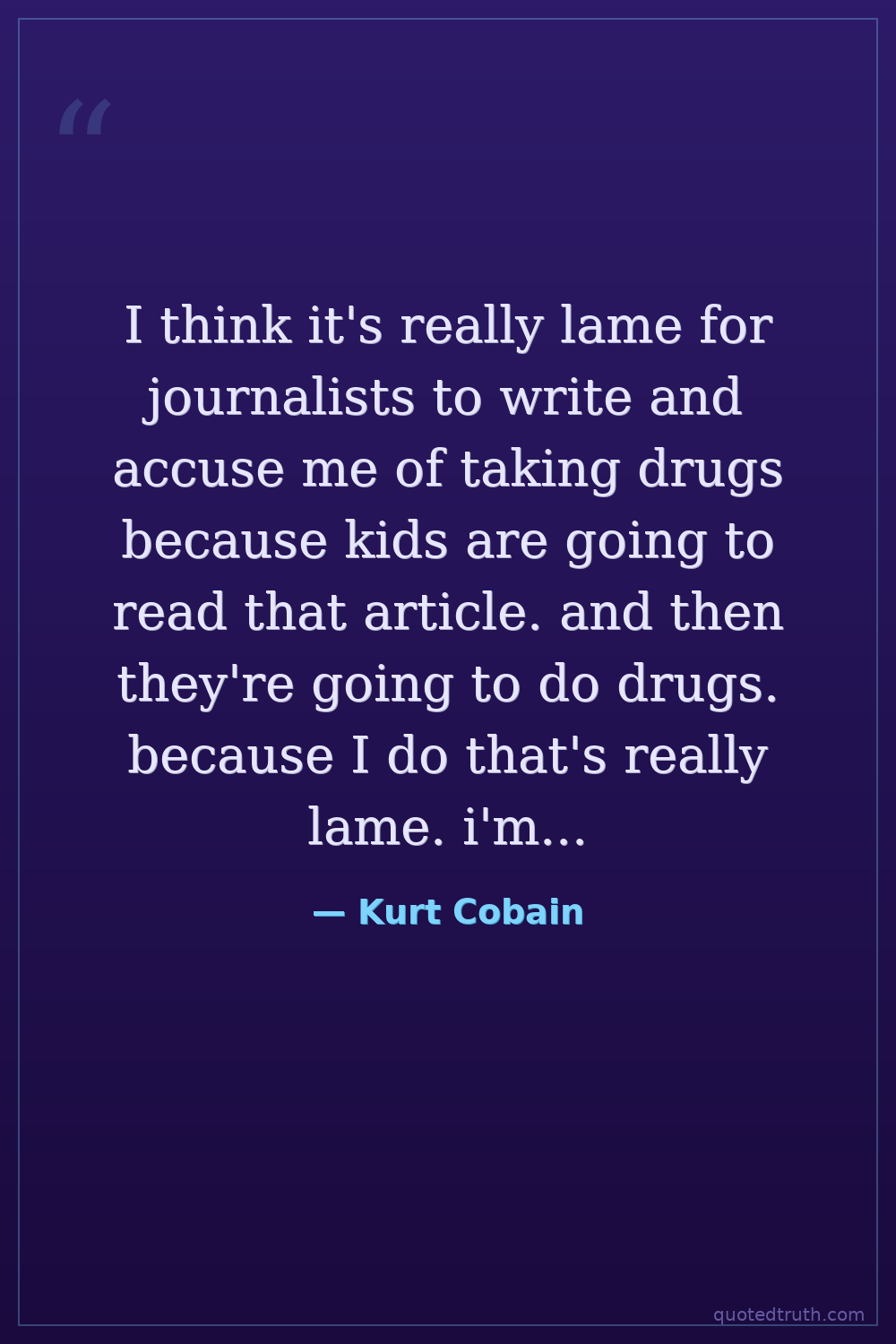 I think it's really lame for journalists to write and accuse me of taking drugs because kids are going to read that article. and then they're going to do drugs. because I do that's really lame. i'm kind of an example for people and there are 9-year-old kids who are into our band. and if they think that I take drugs. and I think it's cool then they're going to do it. too you know I don't like bands who promote drug use because it influences people and it isn't cool