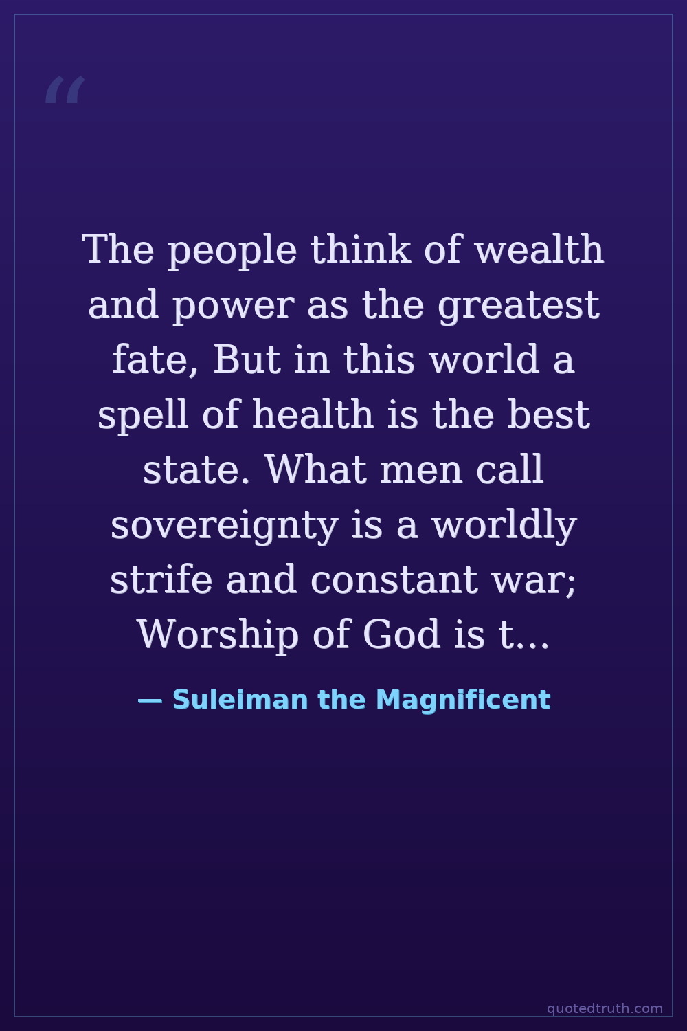 The people think of wealth and power as the greatest fate, But in this world a spell of health is the best state. What men call sovereignty is a worldly strife and constant war; Worship of God is the highest throne, the happiest of all estates. — Suleiman the Magnificent Early Modern Ottoman Sultan