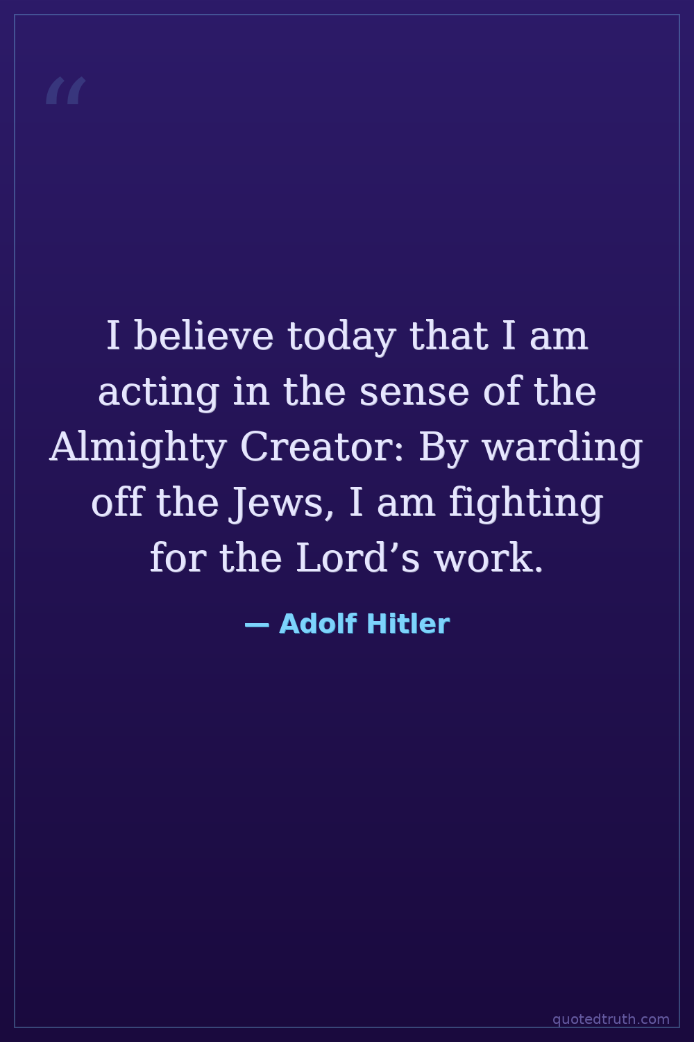 I believe today that I am acting in the sense of the Almighty Creator: By warding off the Jews, I am fighting for the Lord’s work.