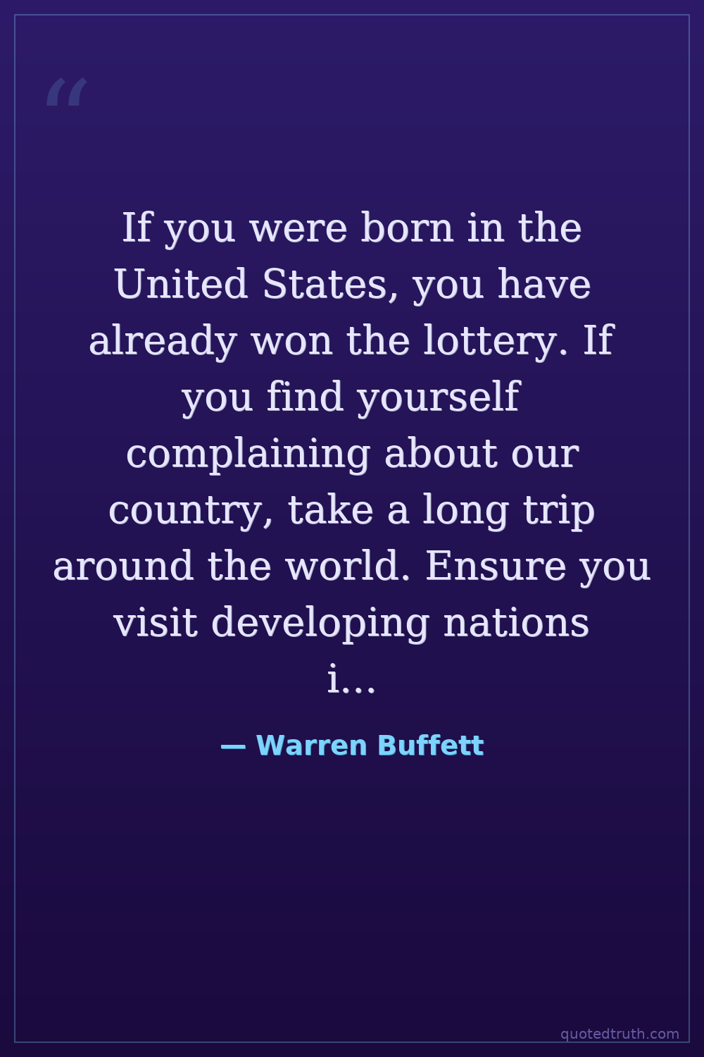 If you were born in the United States, you have already won the lottery. If you find yourself complaining about our country, take a long trip around the world. Ensure you visit developing nations in Asia, South America, and Africa. Also visit Socialist and Communist countries. Talk with locals about their daily lives. Once you return, you will never again complain about America. Not even the DMV.