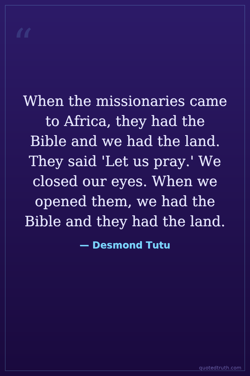 When the missionaries came to Africa, they had the Bible and we had the land. They said 'Let us pray.' We closed our eyes. When we opened them, we had the Bible and they had the land.