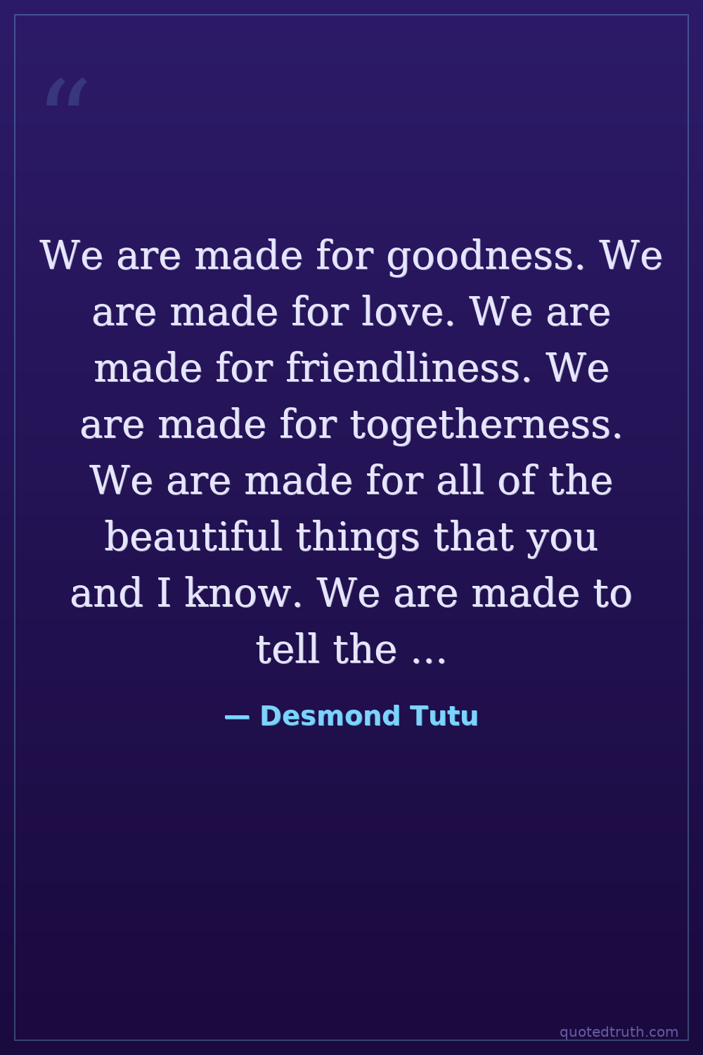 We are made for goodness. We are made for love. We are made for friendliness. We are made for togetherness. We are made for all of the beautiful things that you and I know. We are made to tell the world that there are no outsiders. All are insiders.