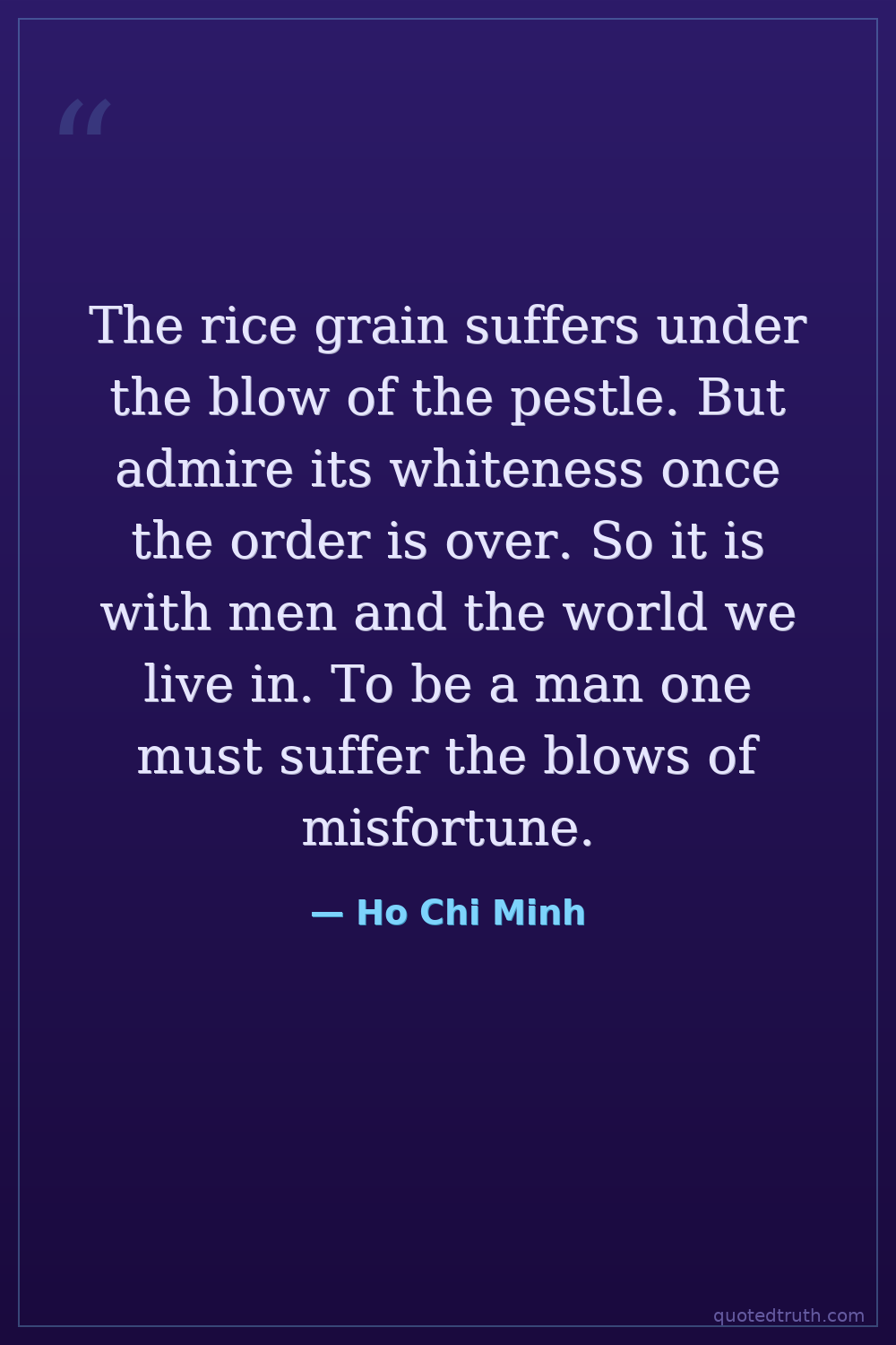 The rice grain suffers under the blow of the pestle. But admire its whiteness once the order is over. So it is with men and the world we live in. To be a man one must suffer the blows of misfortune.