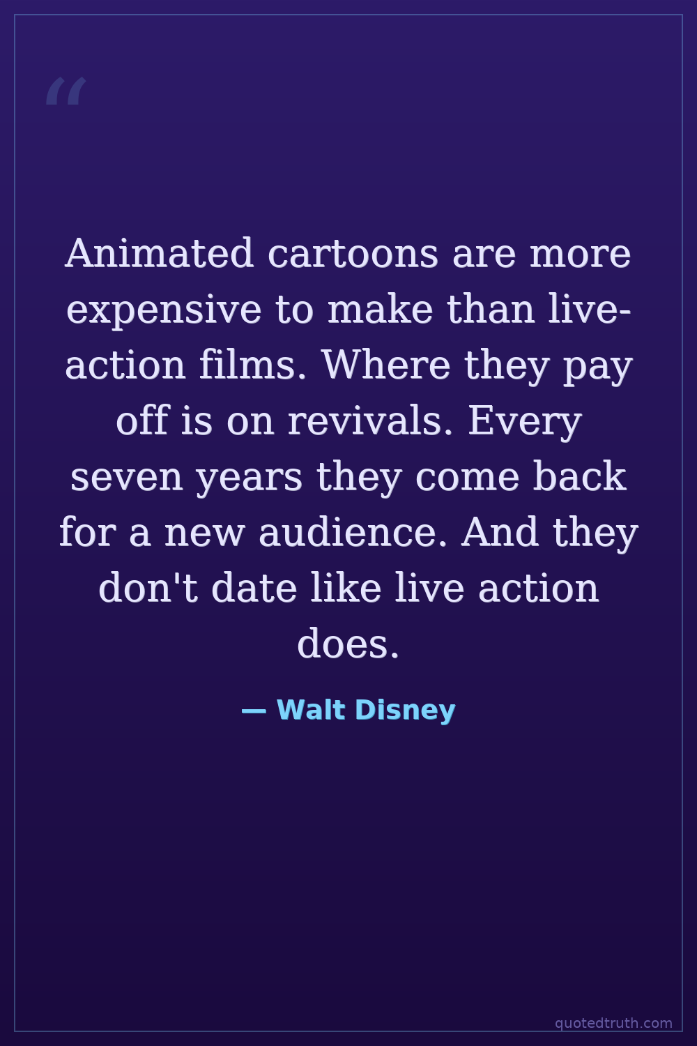 Animated cartoons are more expensive to make than live-action films. Where they pay off is on revivals. Every seven years they come back for a new audience. And they don't date like live action does.