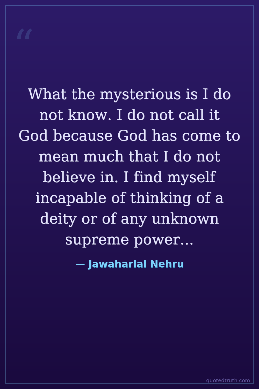 What the mysterious is I do not know. I do not call it God because God has come to mean much that I do not believe in. I find myself incapable of thinking of a deity or of any unknown supreme power in anthropomorphic terms, and the fact that many people think so is continually a source of surprise to me. Any idea of a personal God seems very odd to me.