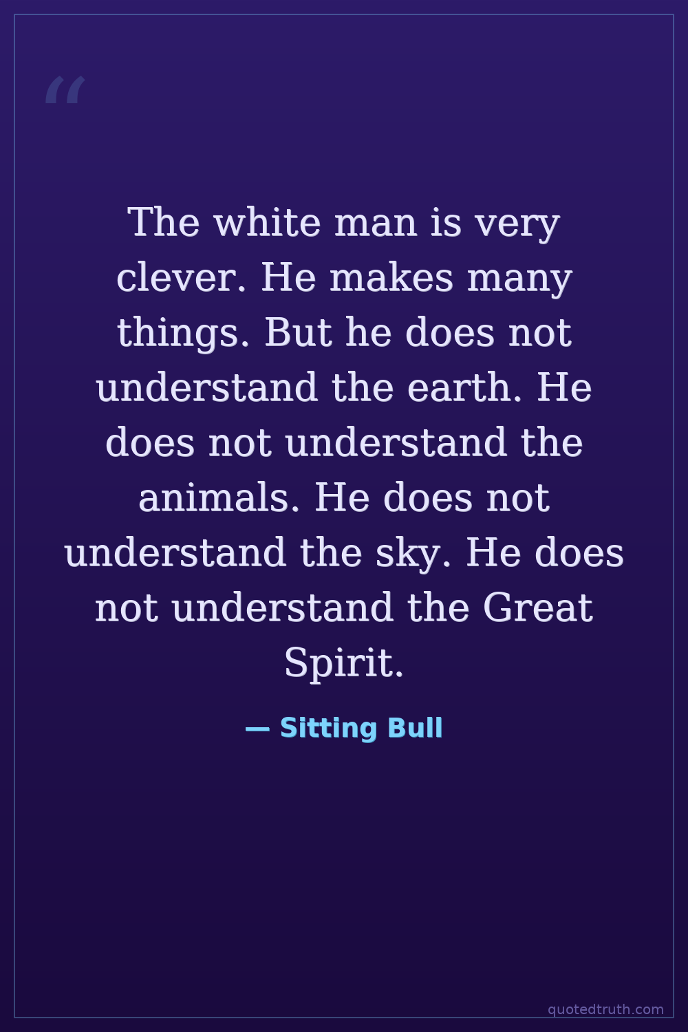 The white man is very clever. He makes many things. But he does not understand the earth. He does not understand the animals. He does not understand the sky. He does not understand the Great Spirit.