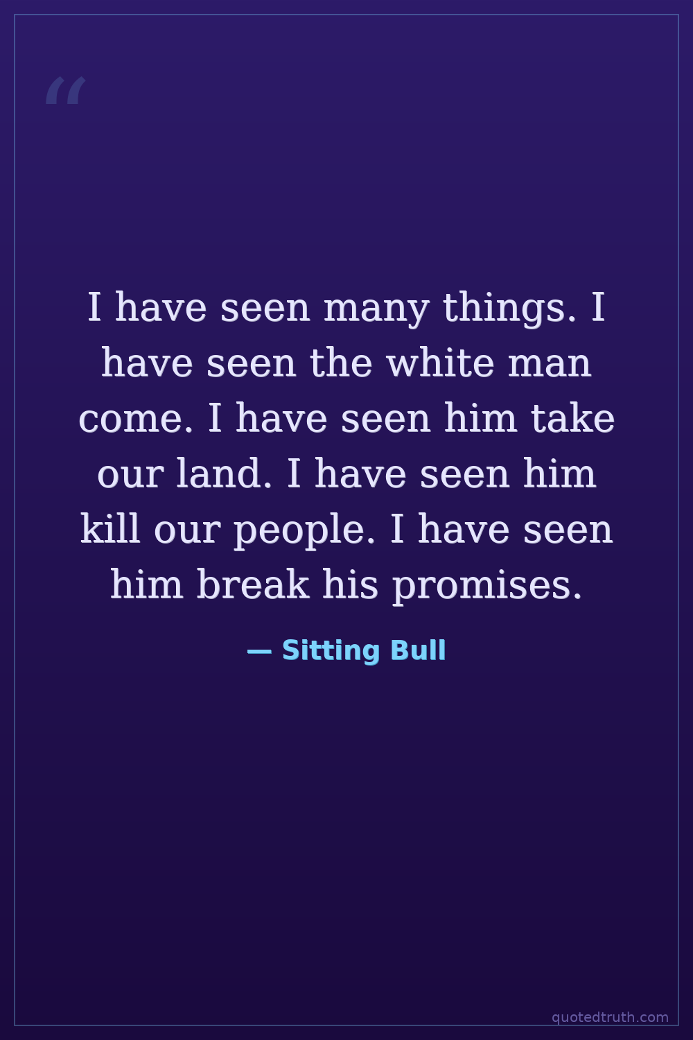 I have seen many things. I have seen the white man come. I have seen him take our land. I have seen him kill our people. I have seen him break his promises.