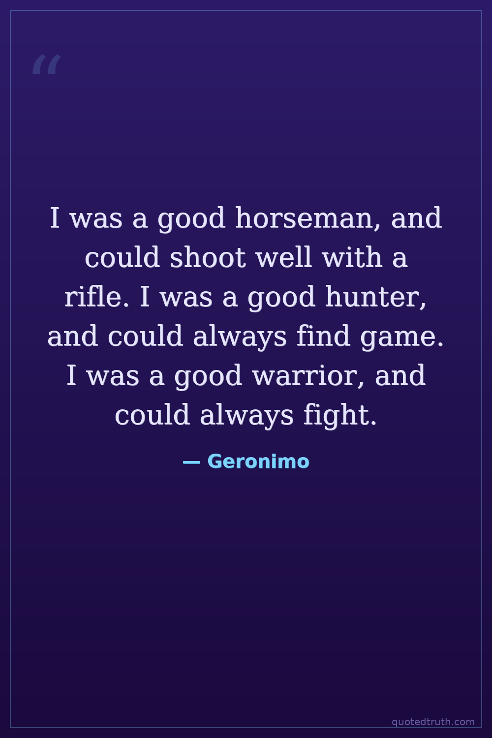 I was a good horseman, and could shoot well with a rifle. I was a good hunter, and could always find game. I was a good warrior, and could always fight.