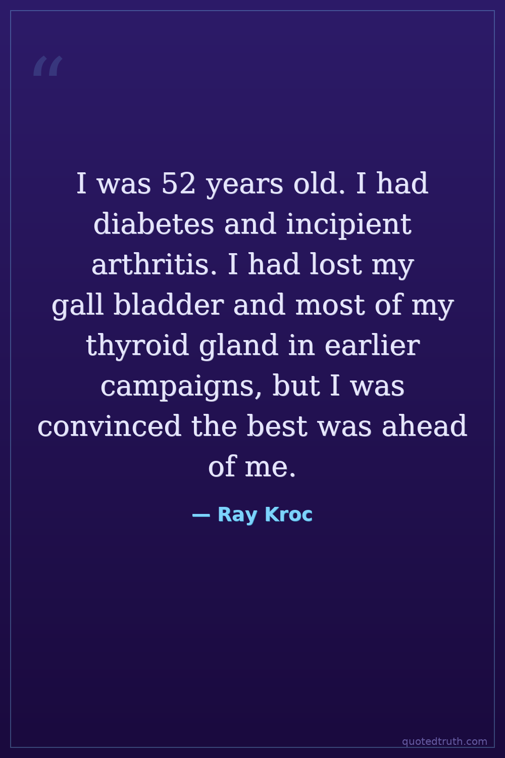 I was 52 years old. I had diabetes and incipient arthritis. I had lost my gall bladder and most of my thyroid gland in earlier campaigns, but I was convinced the best was ahead of me.