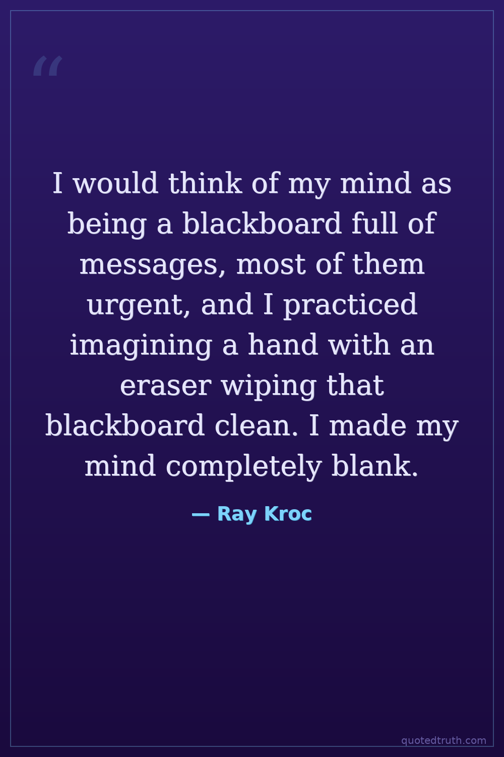 I would think of my mind as being a blackboard full of messages, most of them urgent, and I practiced imagining a hand with an eraser wiping that blackboard clean. I made my mind completely blank.