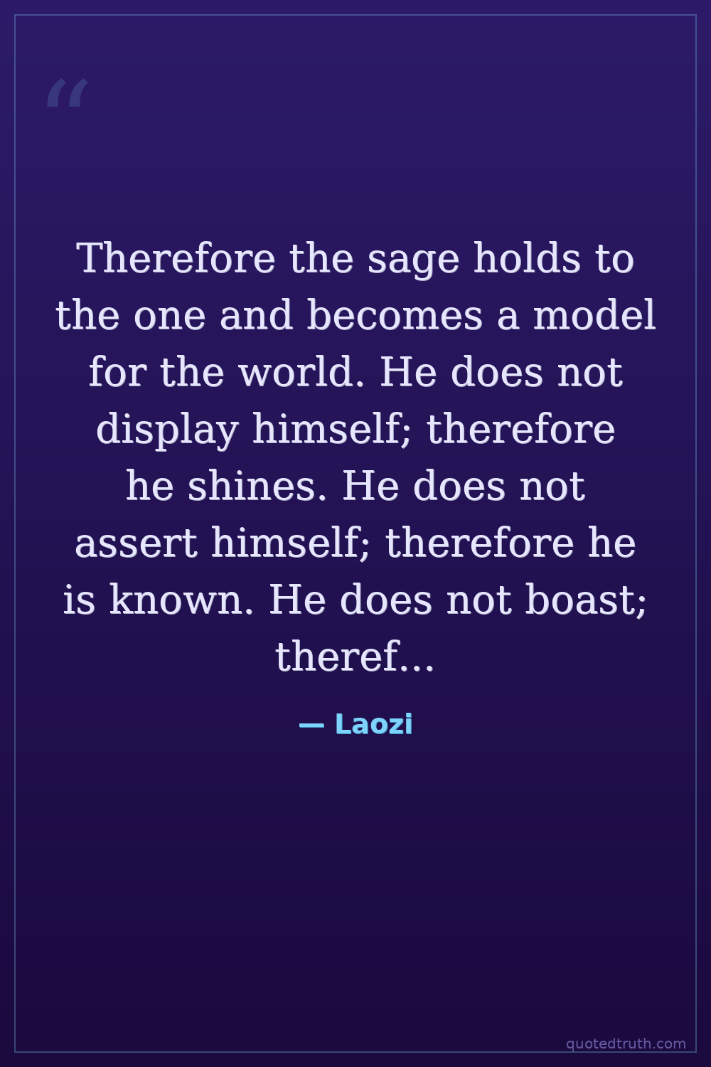 Therefore the sage holds to the one and becomes a model for the world. He does not display himself; therefore he shines. He does not assert himself; therefore he is known. He does not boast; therefore he has merit. He does not contend; therefore no one in the world can contend with him.