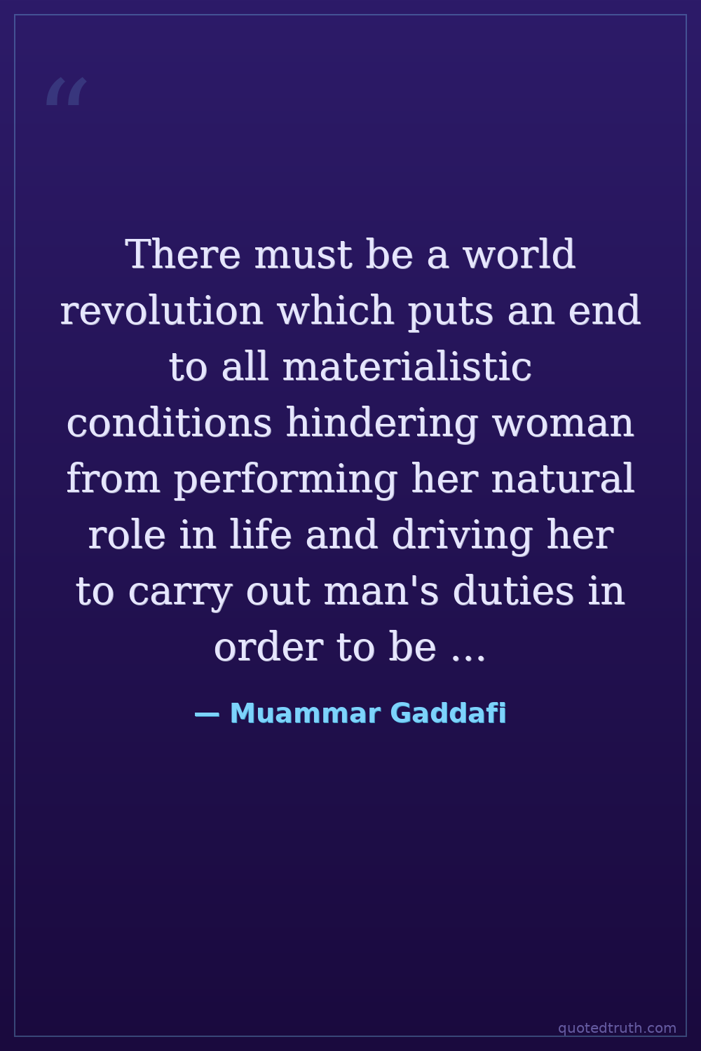 There must be a world revolution which puts an end to all materialistic conditions hindering woman from performing her natural role in life and driving her to carry out man's duties in order to be equal in rights.