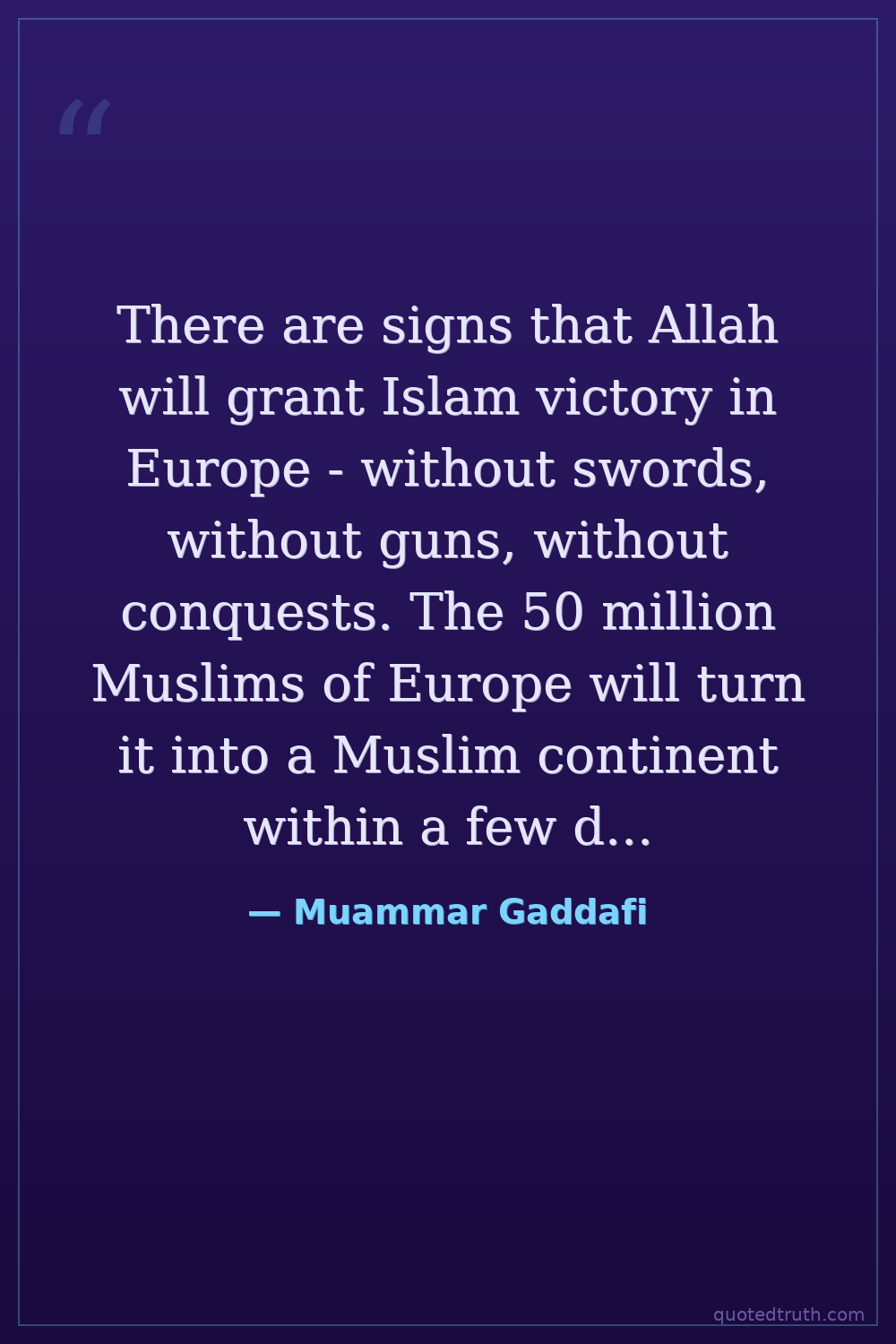 There are signs that Allah will grant Islam victory in Europe - without swords, without guns, without conquests. The 50 million Muslims of Europe will turn it into a Muslim continent within a few decades.