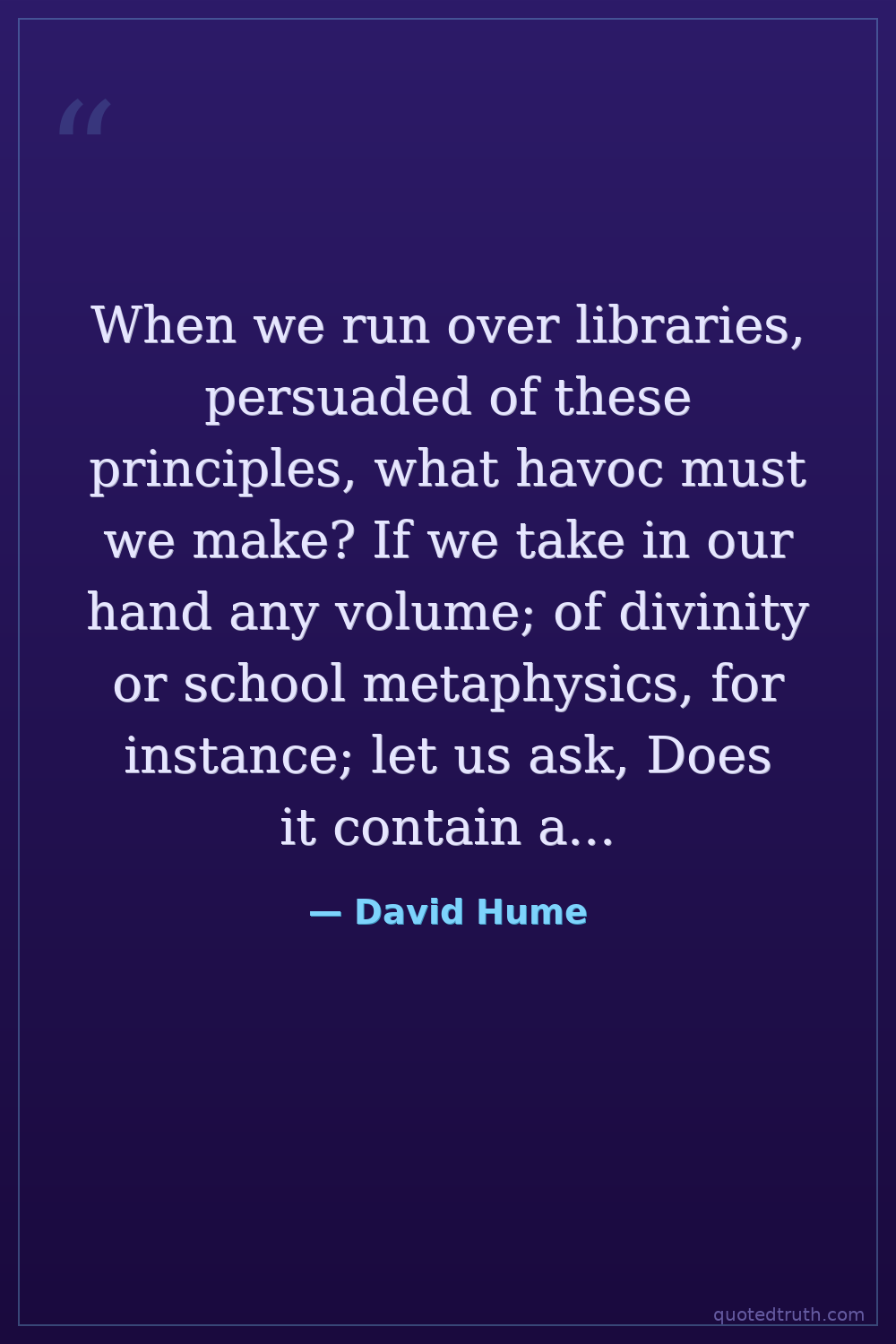 When we run over libraries, persuaded of these principles, what havoc must we make? If we take in our hand any volume; of divinity or school metaphysics, for instance; let us ask, Does it contain any abstract reasoning concerning quantity or number? No. Does it contain any experimental reasoning concerning matter of fact and existence? No. Commit it then to the flames: For it can contain nothing but sophistry and illusion.