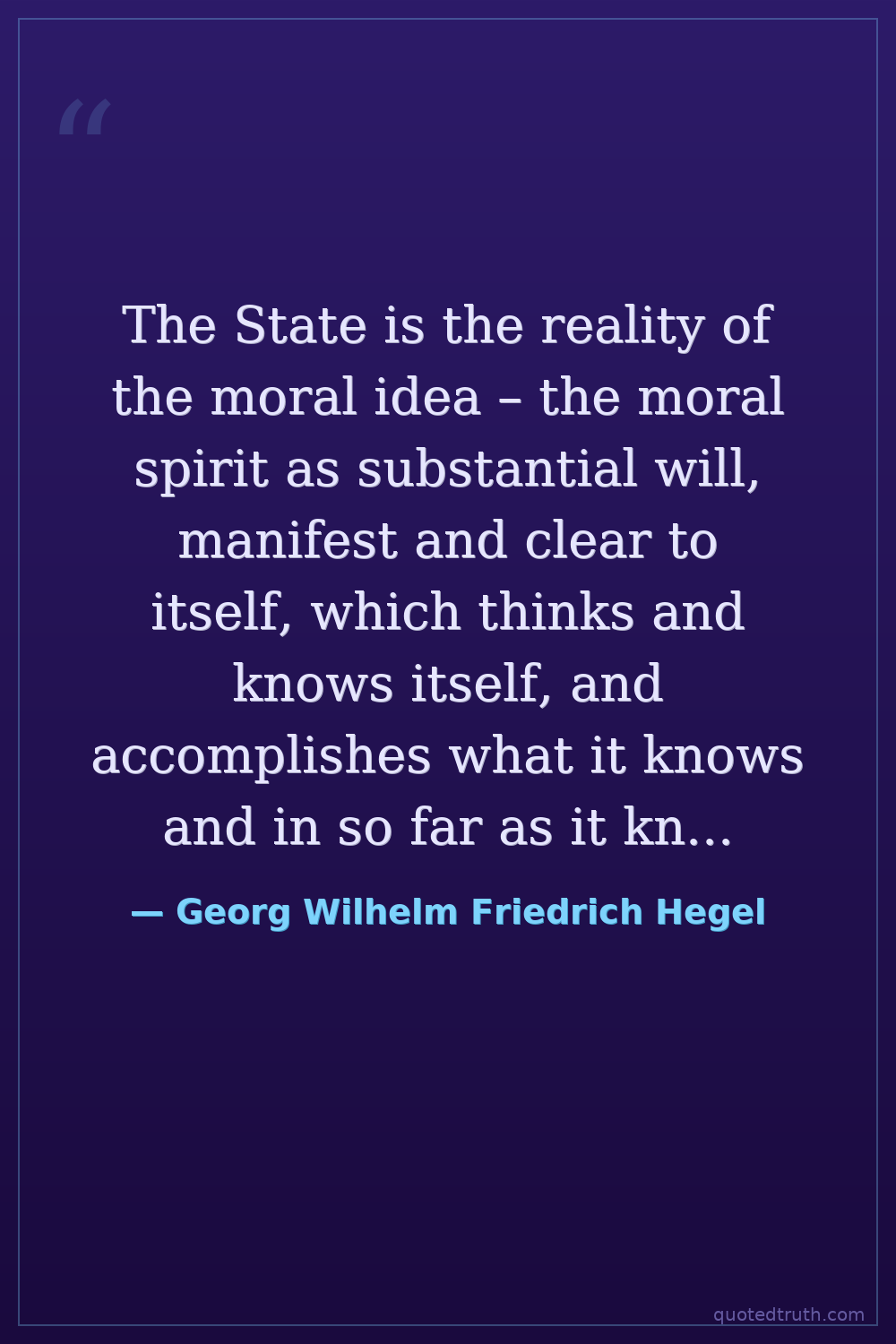 The State is the reality of the moral idea – the moral spirit as substantial will, manifest and clear to itself, which thinks and knows itself, and accomplishes what it knows and in so far as it knows.