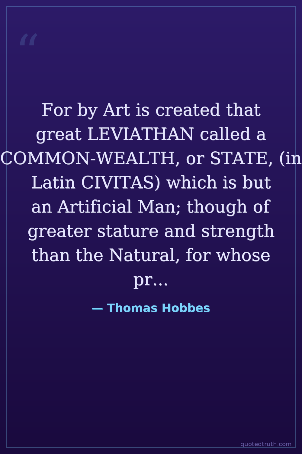 For by Art is created that great LEVIATHAN called a COMMON-WEALTH, or STATE, (in Latin CIVITAS) which is but an Artificial Man; though of greater stature and strength than the Natural, for whose protection and defence it was intended; and in which, the Soveraignty is an Artificial Soul, as giving life and motion to the whole body; The Magistrates, and other Officers of Judicature and Execution, artificial Joynts; Reward and Punishment (by which fastned to the seat of the Soveraignty, every joint and member is moved to performe his duty) are the Nerves, that do the same in the Body Naturall; The Wealth and Riches of all the particular members, are the Strength; Salus Populi, (the Peoples Safety) its Businesse; Counsellors, by whom all things needfull for it to know, are suggested unto it, are the Memory; Equity and Laws, an artificial Reason and Will; Concord, Health; Sedition, Sicknesse; and Civill War, Death. Lastly, the Pacts and Covenants, by which the parts of this Body Politique were at first made, set together, and united, resemble that Fiat, or the Let us make man, pronounced by God in the Creation.