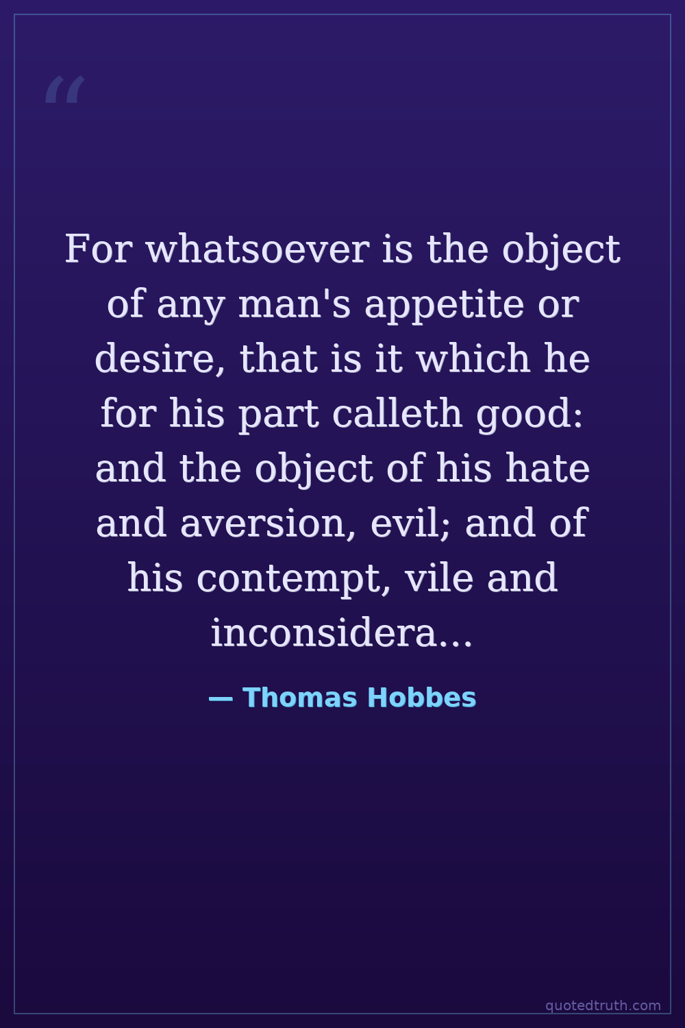 For whatsoever is the object of any man's appetite or desire, that is it which he for his part calleth good: and the object of his hate and aversion, evil; and of his contempt, vile and inconsiderable. For these words of good, evil, and contemptible, are ever used with relation to the person that useth them: there being nothing simply and absolutely so; nor any common rule of good and evil, to be taken from the nature of the objects themselves; but from the person of the man (where there is no Commonwealth;) or, (in a Commonwealth,) from the person that representeth it; or from an Arbitrator or Judge, whom men disagreeing shall by consent set up, and make his sentence the rule thereof.