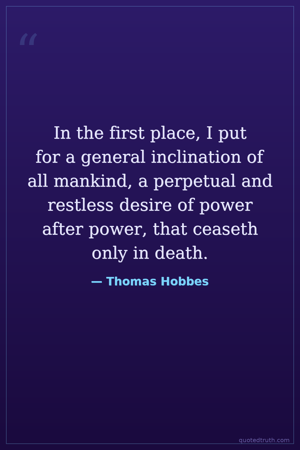 In the first place, I put for a general inclination of all mankind, a perpetual and restless desire of power after power, that ceaseth only in death.