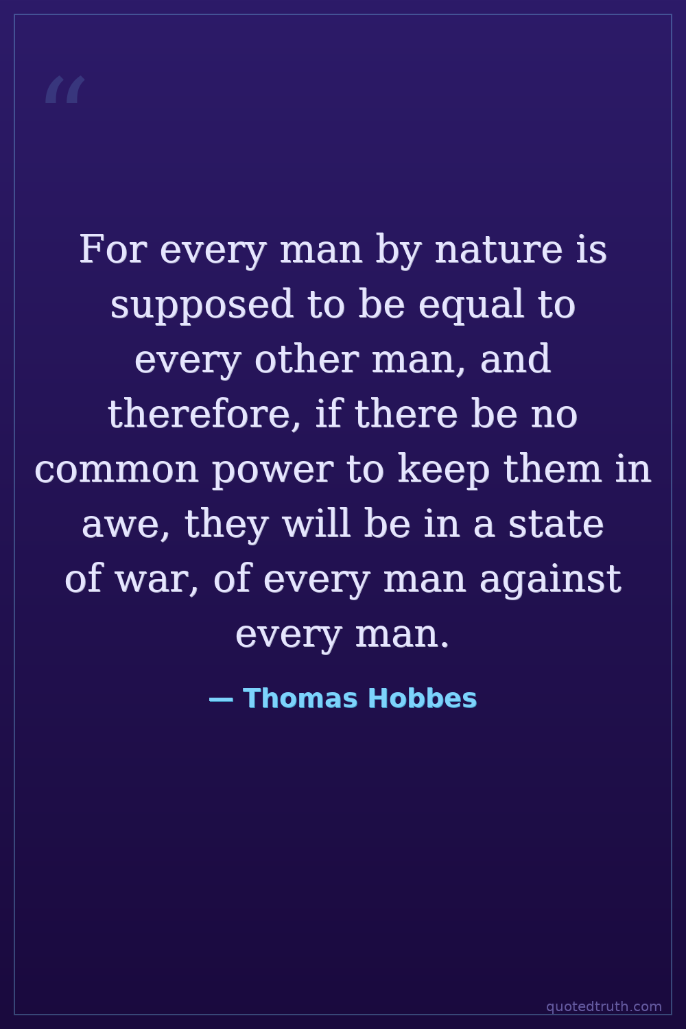 For every man by nature is supposed to be equal to every other man, and therefore, if there be no common power to keep them in awe, they will be in a state of war, of every man against every man.