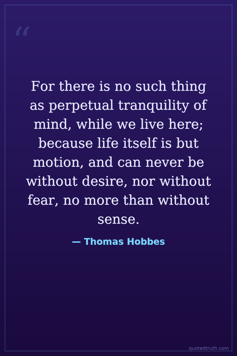 For there is no such thing as perpetual tranquility of mind, while we live here; because life itself is but motion, and can never be without desire, nor without fear, no more than without sense.