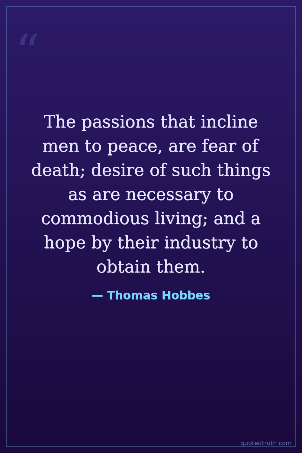 The passions that incline men to peace, are fear of death; desire of such things as are necessary to commodious living; and a hope by their industry to obtain them.