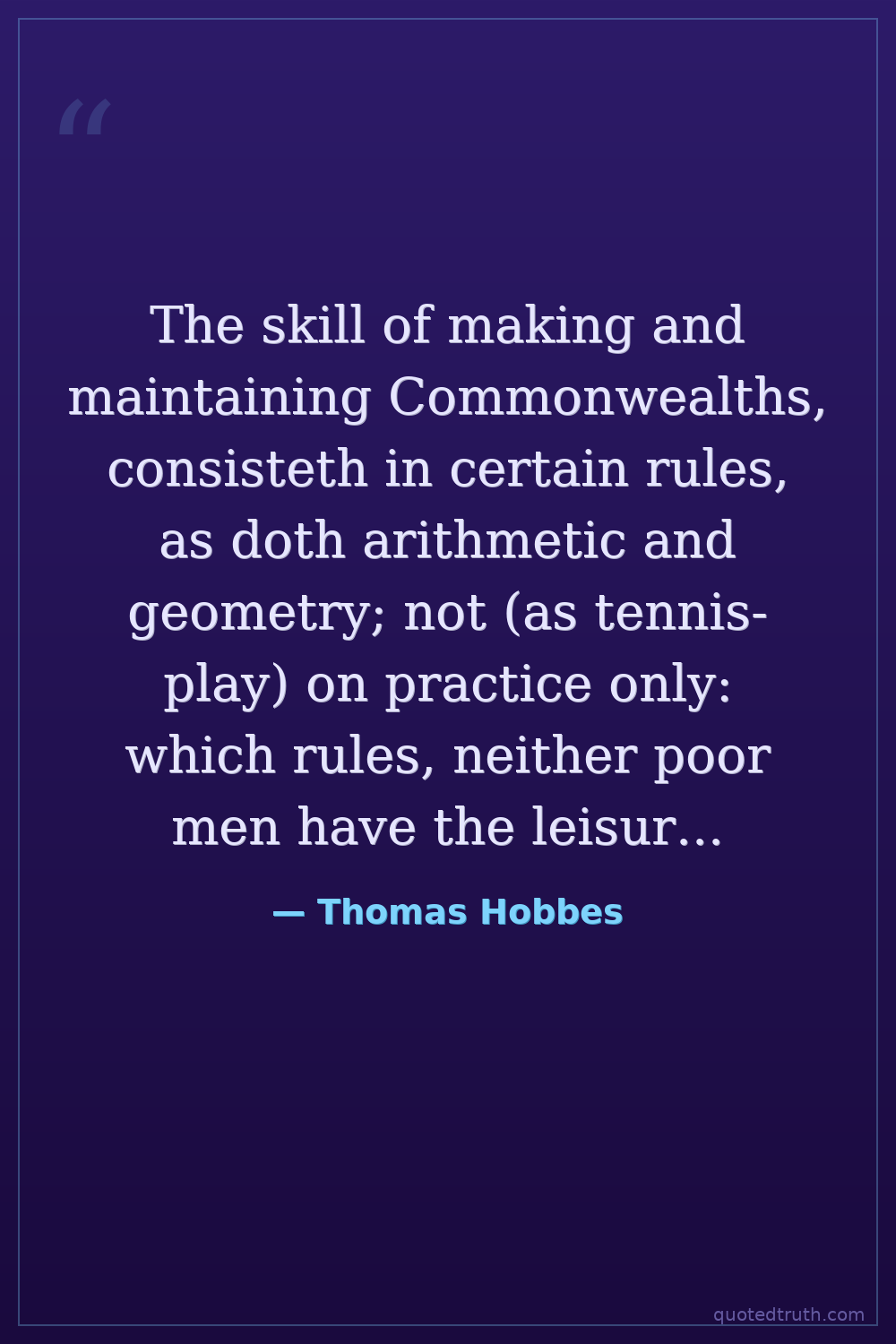 The skill of making and maintaining Commonwealths, consisteth in certain rules, as doth arithmetic and geometry; not (as tennis-play) on practice only: which rules, neither poor men have the leisure, nor men that have had the leisure, have hitherto had the curiosity, or the method to find out.