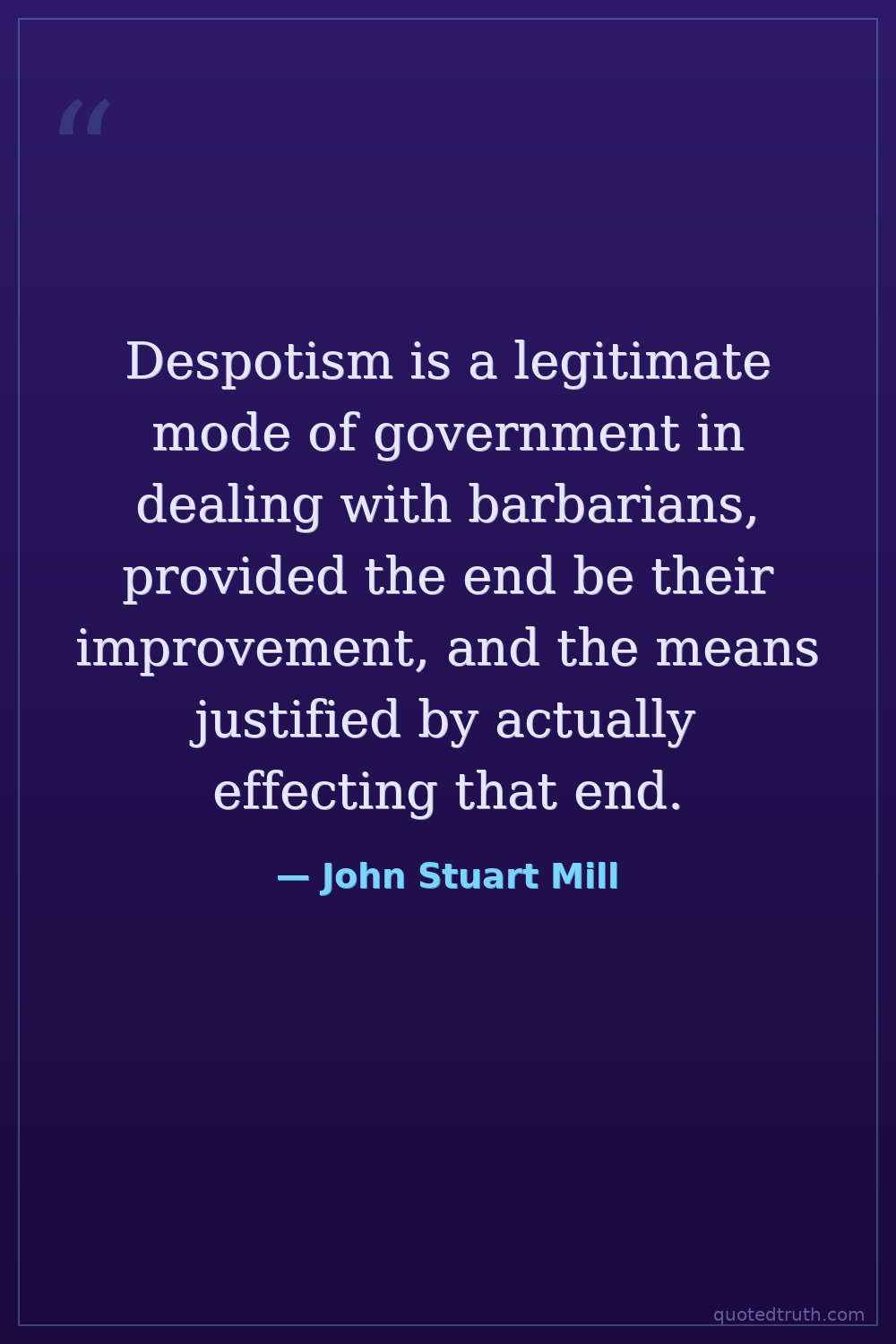 Despotism is a legitimate mode of government in dealing with barbarians, provided the end be their improvement, and the means justified by actually effecting that end.