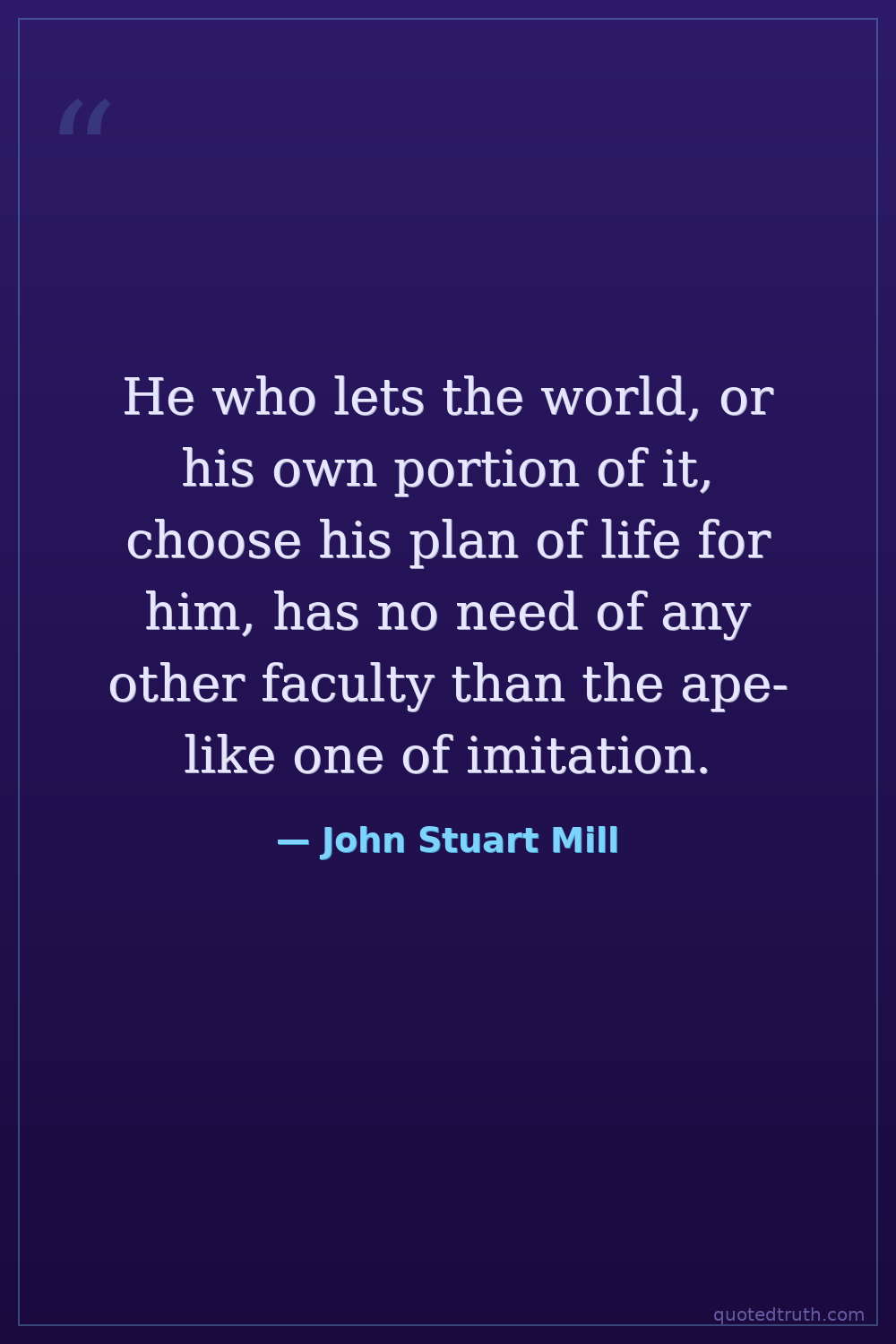 He who lets the world, or his own portion of it, choose his plan of life for him, has no need of any other faculty than the ape-like one of imitation.