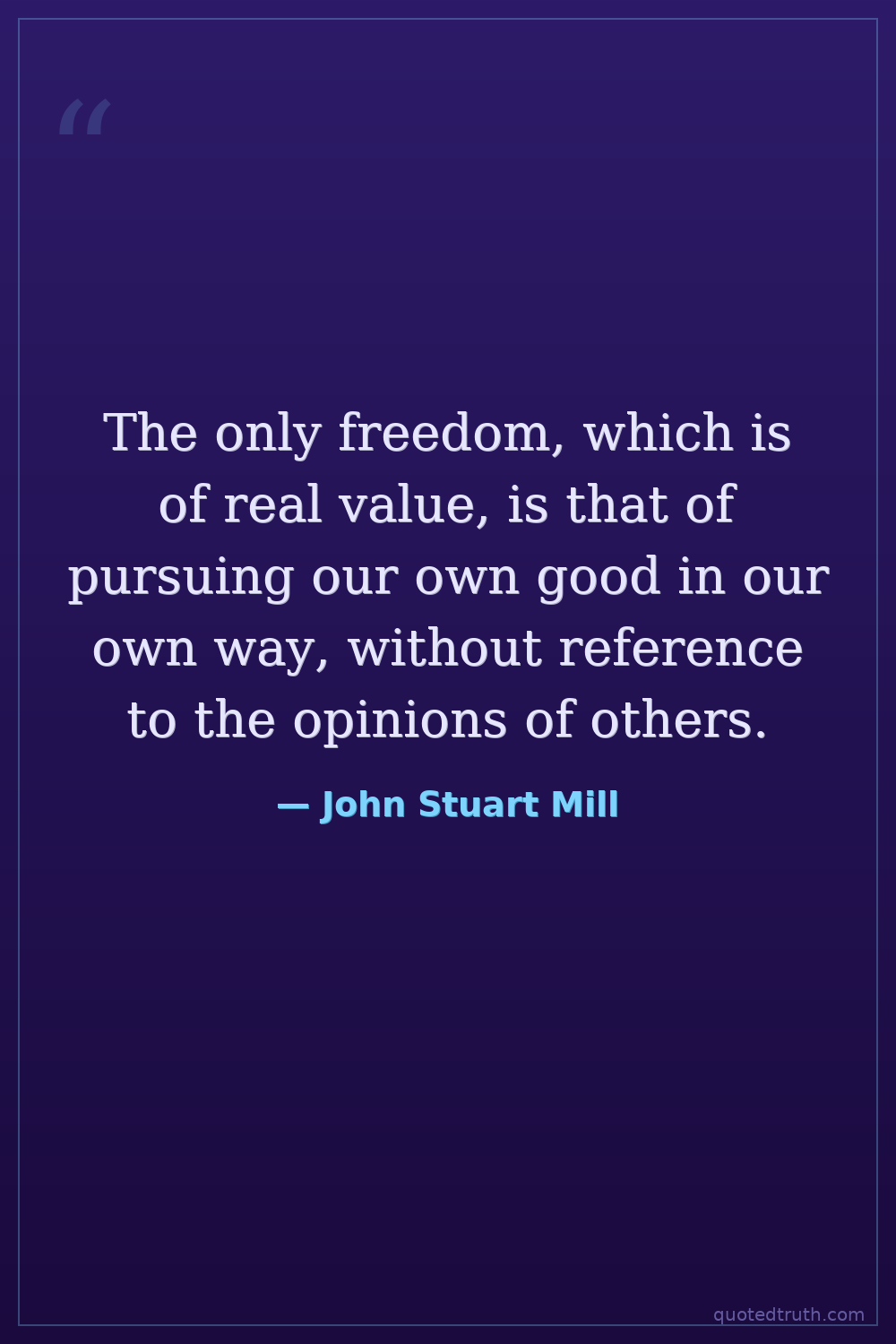 The only freedom, which is of real value, is that of pursuing our own good in our own way, without reference to the opinions of others.