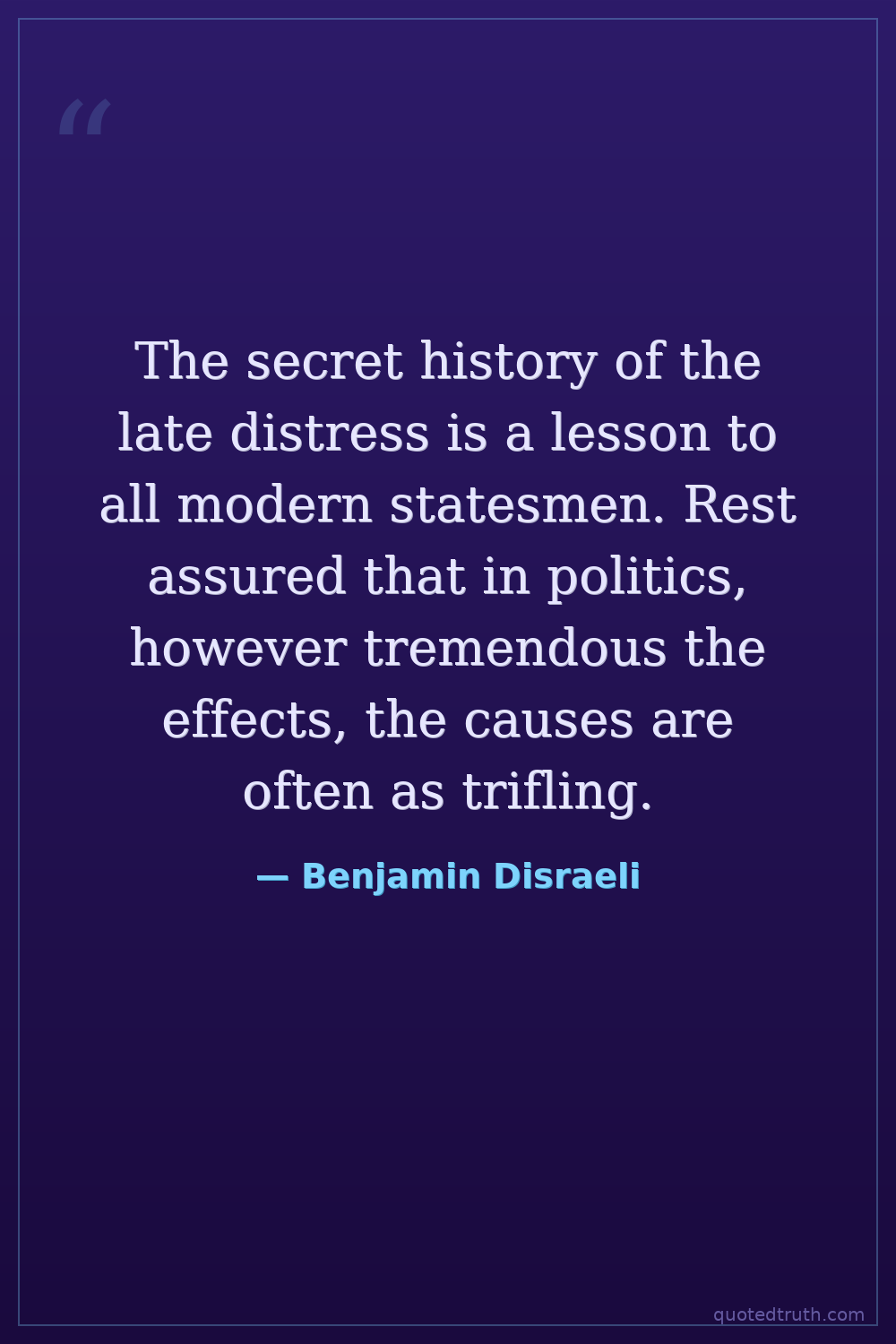 The secret history of the late distress is a lesson to all modern statesmen. Rest assured that in politics, however tremendous the effects, the causes are often as trifling.