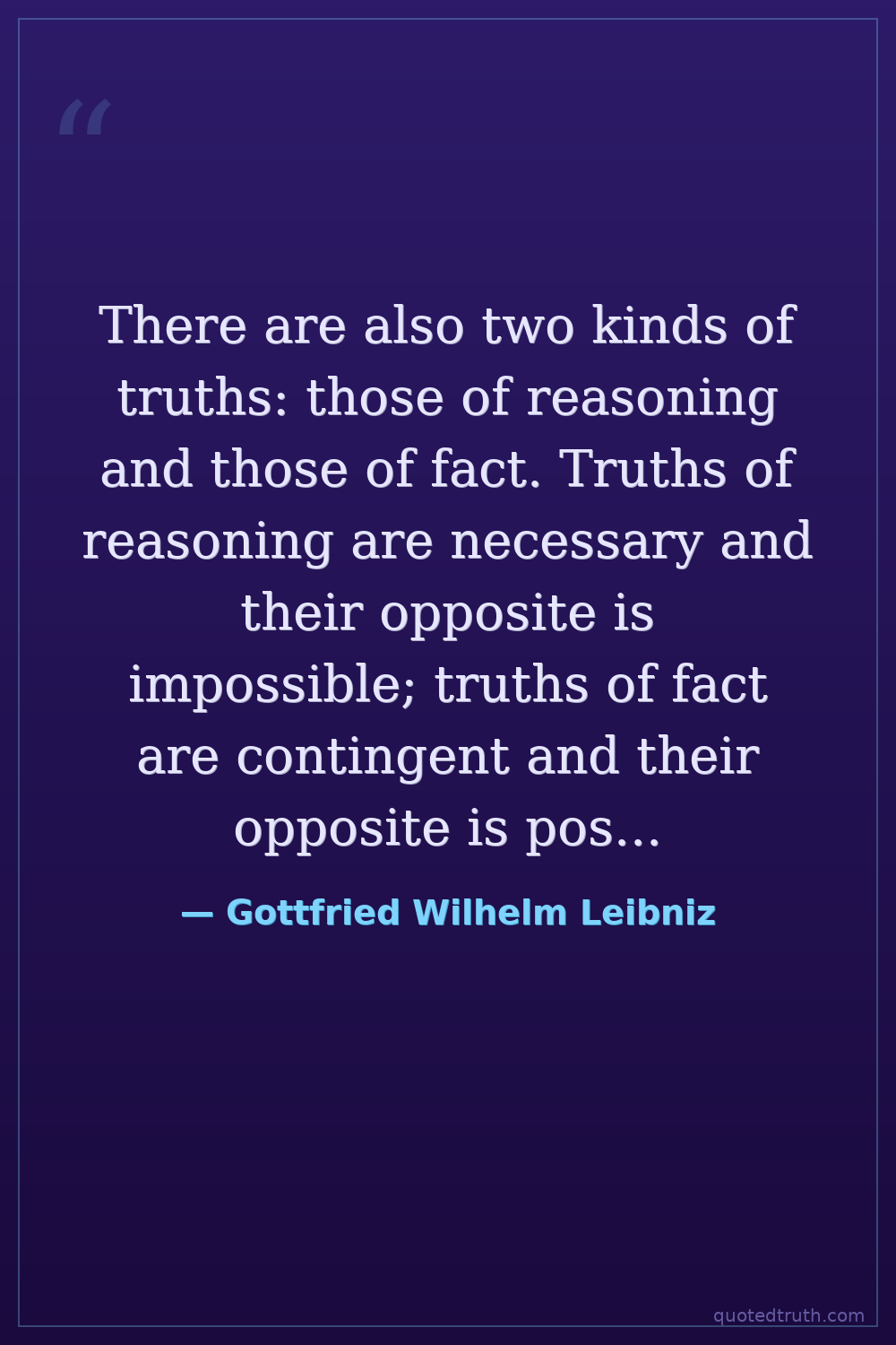 There are also two kinds of truths: those of reasoning and those of fact. Truths of reasoning are necessary and their opposite is impossible; truths of fact are contingent and their opposite is possible.