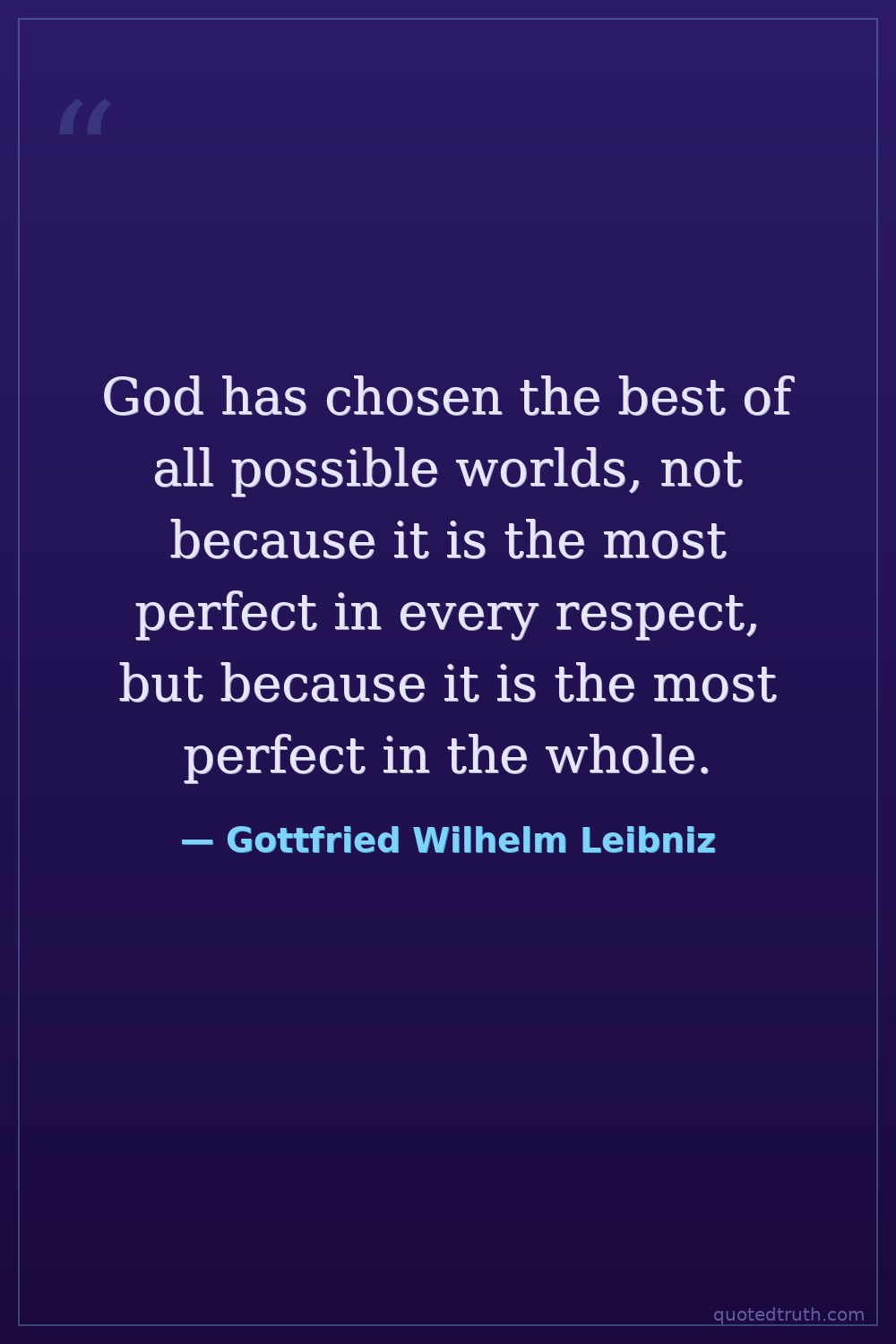 God has chosen the best of all possible worlds, not because it is the most perfect in every respect, but because it is the most perfect in the whole.