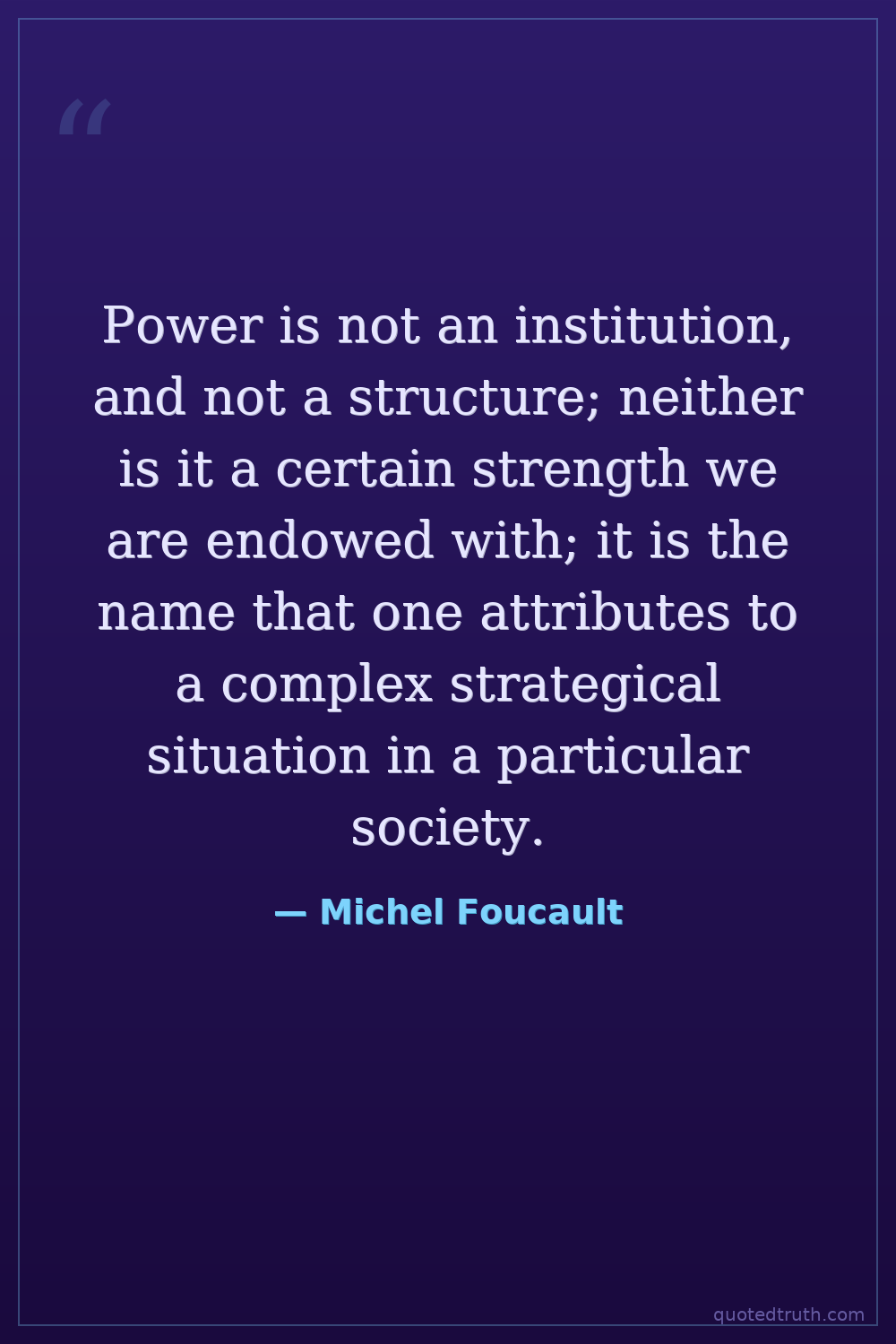Power is not an institution, and not a structure; neither is it a certain strength we are endowed with; it is the name that one attributes to a complex strategical situation in a particular society.