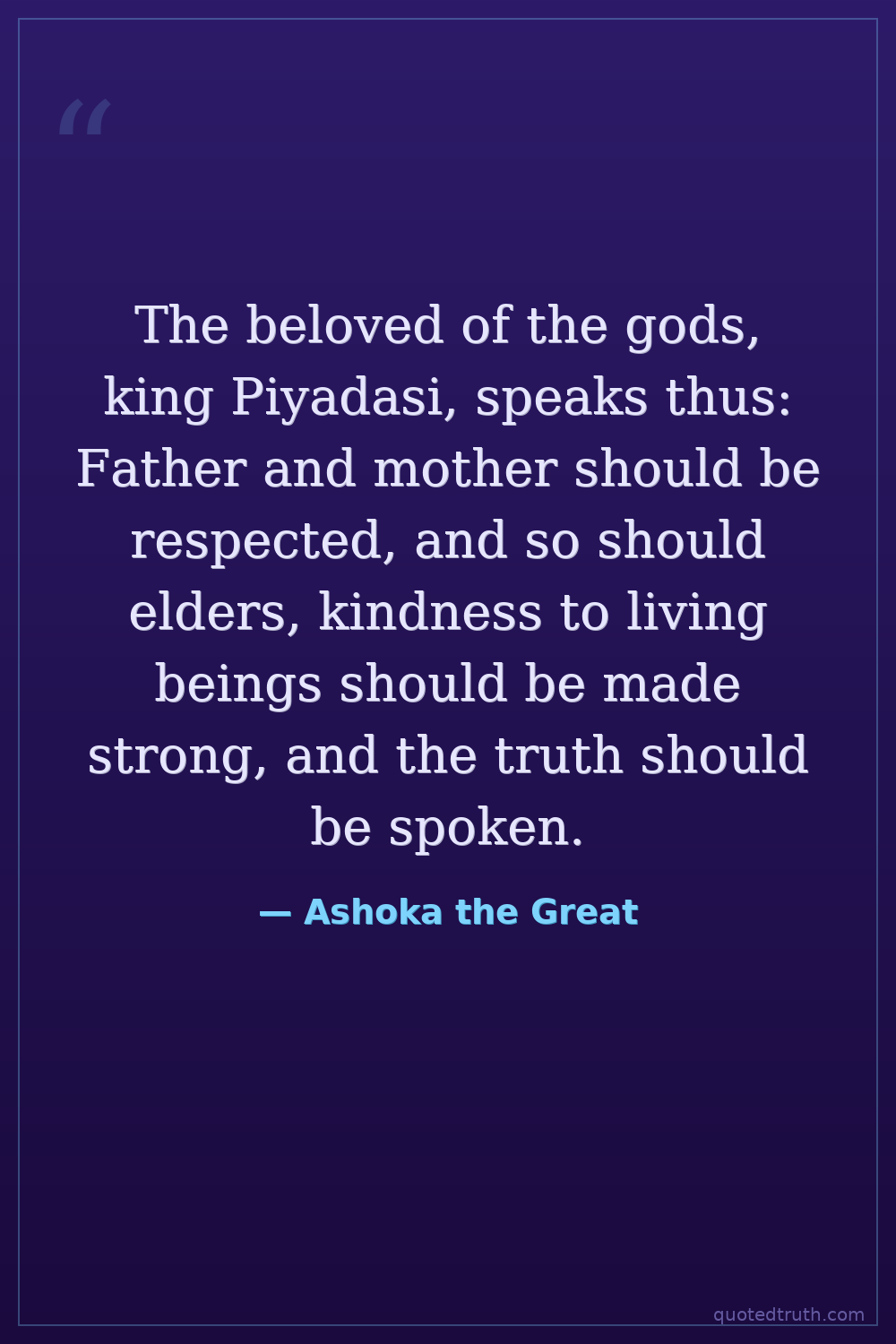 The beloved of the gods, king Piyadasi, speaks thus: Father and mother should be respected, and so should elders, kindness to living beings should be made strong, and the truth should be spoken.