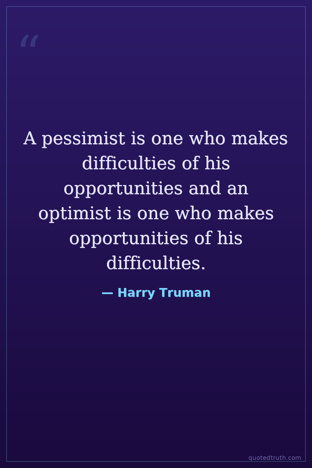 A pessimist is one who makes difficulties of his opportunities and an optimist is one who makes opportunities of his difficulties.